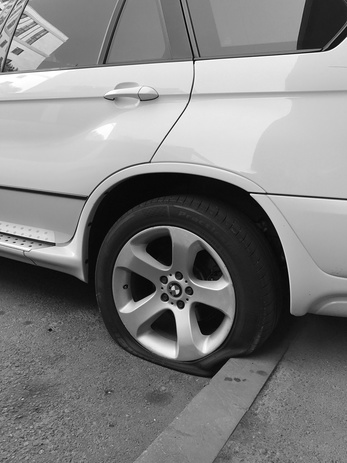 This tire was punctured deliberately by the car's owner. People used this method to block traffic and, at the same time, have a convincing explanation in case the police show up.